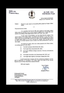 Punjab Chief Minister, Bhagwant Singh Mann, on Friday urged the Punjab Governor to clear all the five pending Bills including the Sikh Gurdwaras (Amendment) Bill, 2023, the Punjab Police (Amendment) Bill, 2023, the Punjab Affiliated Colleges (Security of Service) (Amendment) Bill, 2023, the Punjab Universities Laws (Amendment) Bill, 2023 and Punjab State Vigilance Commission (Repeal) Bill, 2022. “ I would request that in keeping with the constitutional obligation and the spirit of democracy as elucidated in the orders on November 10 of the Supreme Court, these bills be cleared forthwith,” the Chief Minister said in a letter written to the Governor today.