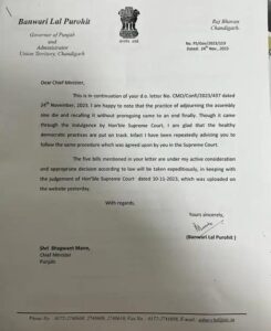 Providing details in his letter to the Governor, Chief Minister Mann has also highlighted that out of five pending bills four were passed in the sittings of the budget session held on June 19 and 20. “ In your earlier communications, you had stated that the validity of the special sittings of the Vidhan Sabha, convened by the Speaker in June 2023 was in doubt, which was an impediment for clearing the bills. The issue regarding the sitting of Punjab Vidhan Sabha on June 19 and June 20 has been held valid by the  Supreme Court in its orders pronounced in court on November 10,” the Chief Minister further said.