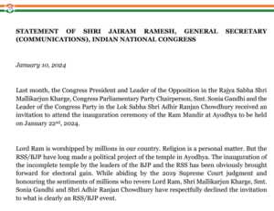 The Congress party on Wednesday said it will skip the upcoming inauguration of the Ram Mandir in Ayodhya on January 22. ” Congress president Mallikarjun Kharge, Congress Parliamentary Party chairperson Sonia Gandhi and Leader of Congress in Lok Sabha Adhir Ranjan Chowdhury will not attend the Ram Mandir inauguration. The consecration event has “clearly” become an RSS and BJP event,” Jairam Ramesh, General Secretary (Communications) said.